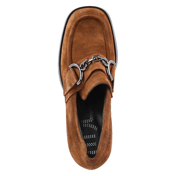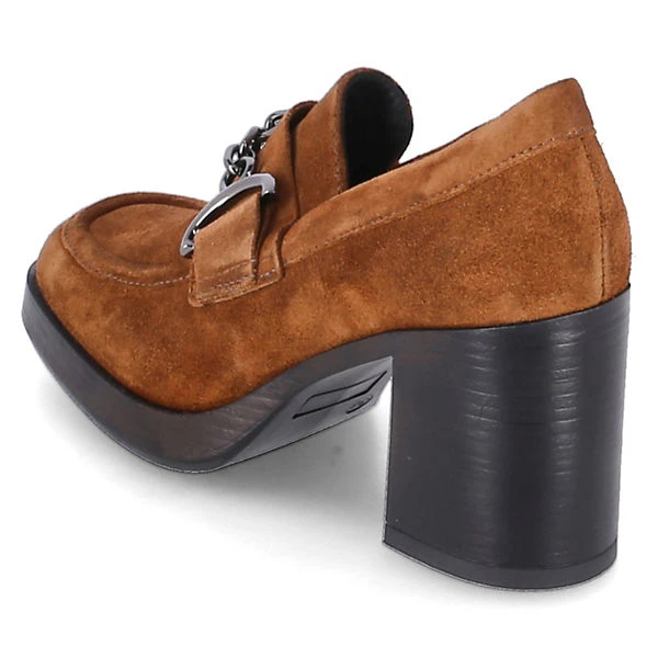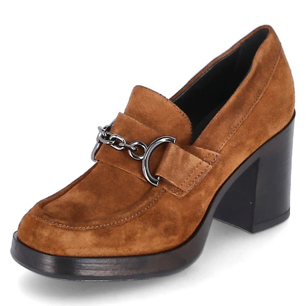 MJUS Damen Hochfront-Pumps MICAELA Braun Rauleder – samtige Oberfläche – Riemen mit zierendem Kettenelement über den Spann – ca. 8,5 cm hoher Blockabsatz – verstärkter Zehen- und Fersenbereich – gepolsterte Lederdecksohle – flexible, rutschhemmende Laufsohle