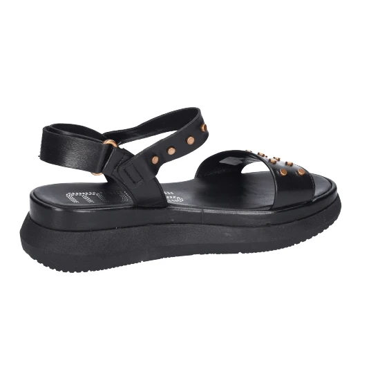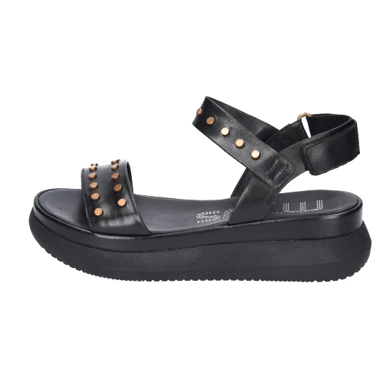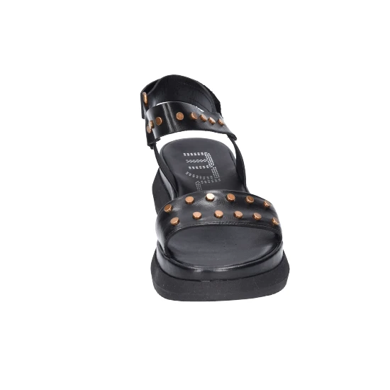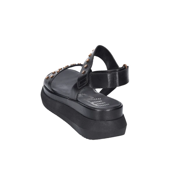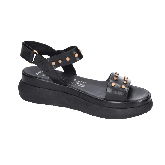 MJUS – Damenschuh Sandale City – Pasa M38021-0101-6002-5051 – nero – Lederfutter – Modische Damensandale in schwarz mit goldenen Nieten verziert aus Obermaterial echt Glattleder. Ebenfalls aus echtem Leder besteht das Innenmaterial und die bequem gepolsterte Decksohle. Die rutschhemmende Plateausohle aus Gummi dämpft jeden Auftritt optimal ab, der Keilabsatz misst 30mm, der Plateau mindert die Höhe um 20mm. Ein praktisches Klettverschlussriemchen ermöglicht einen leichten Einstieg und optimale Anpassung. KS.