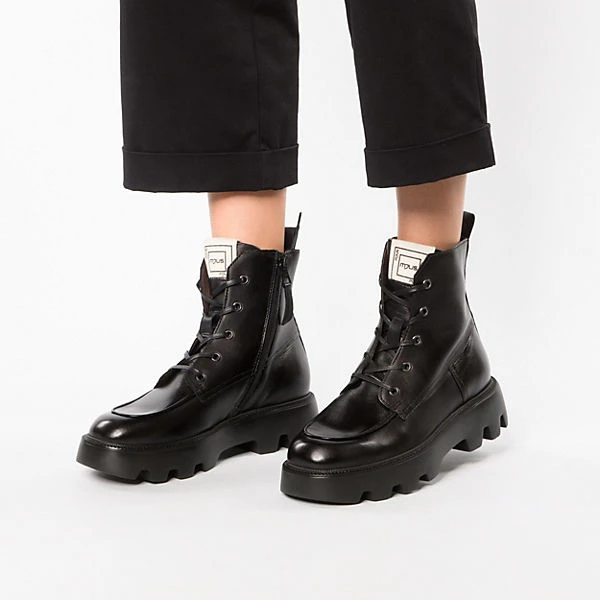 Diese stylischen Schnürstiefeletten von MJUS ergänzen verschiedene Looks. Der Blockabsatz verbindet einen femininen Auftritt mit hohem Komfort. Das Fußbett besteht aus atmungsaktivem Leder, das ein angenehmes Trageerlebnis begünstigt. Das Obermaterial zeichnet sich durch das hochwertige Rindsleder aus. Der Schuh schließt per Reißverschluss.
